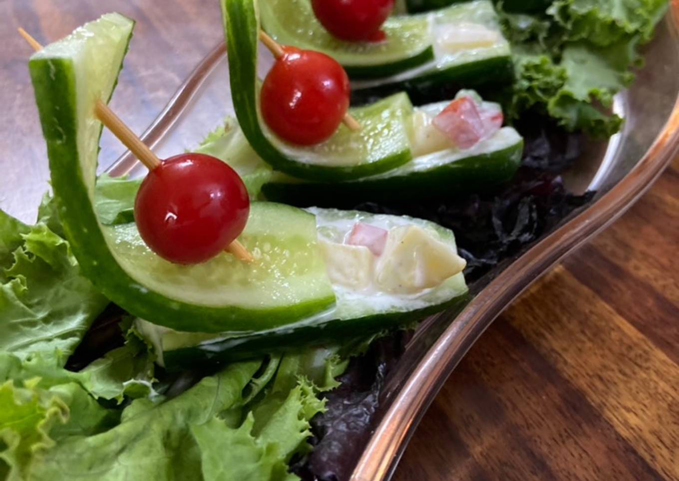 - Cut the cucumber horizontally and fill the mayo filling in it. Decorate with cherry tomatoes and salad leaves. Enjoy this refreshing salad with your loved ones.